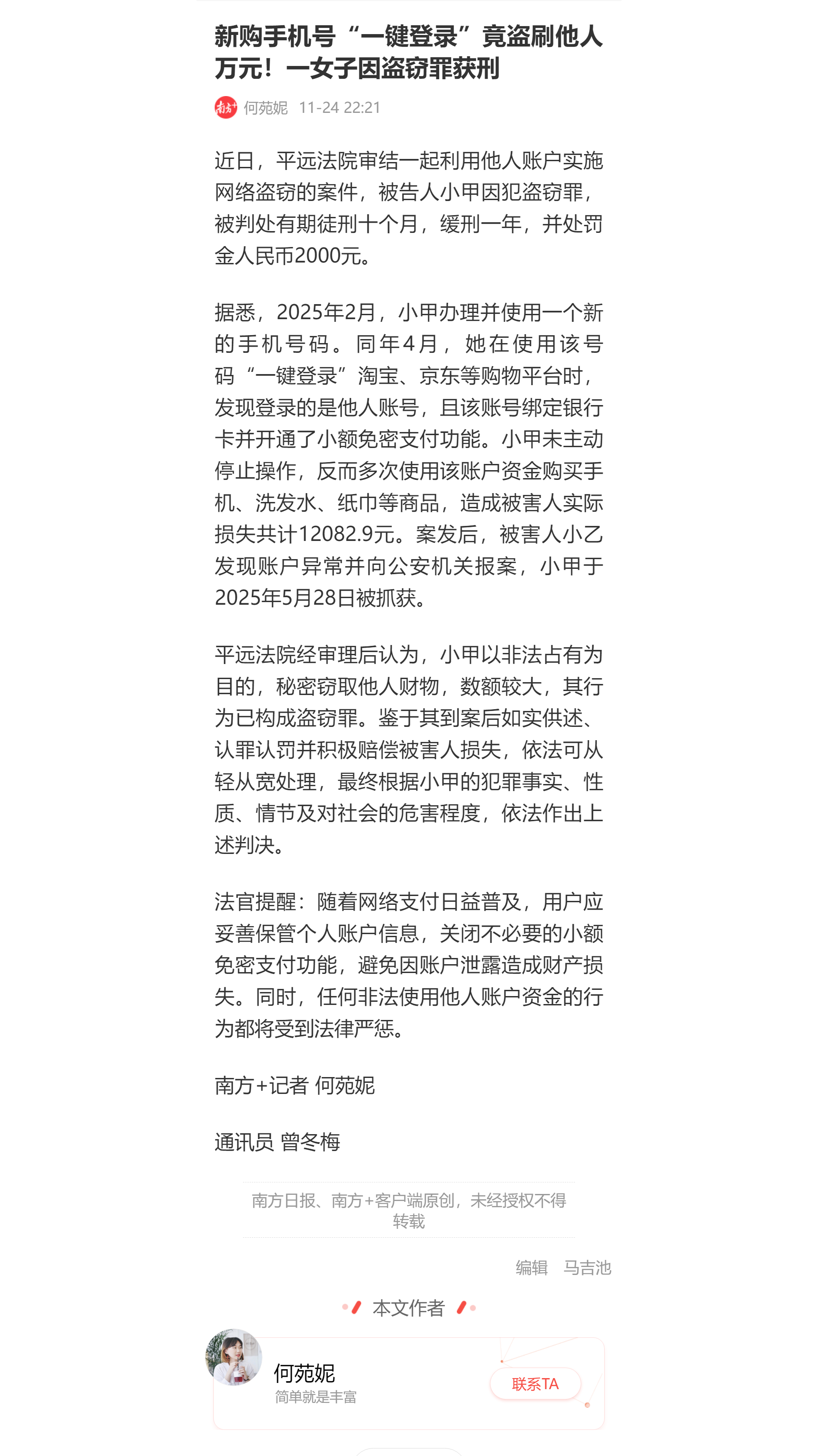 新购手机号“一键登录”竟盗刷他人万元!一女子因盗窃罪获刑