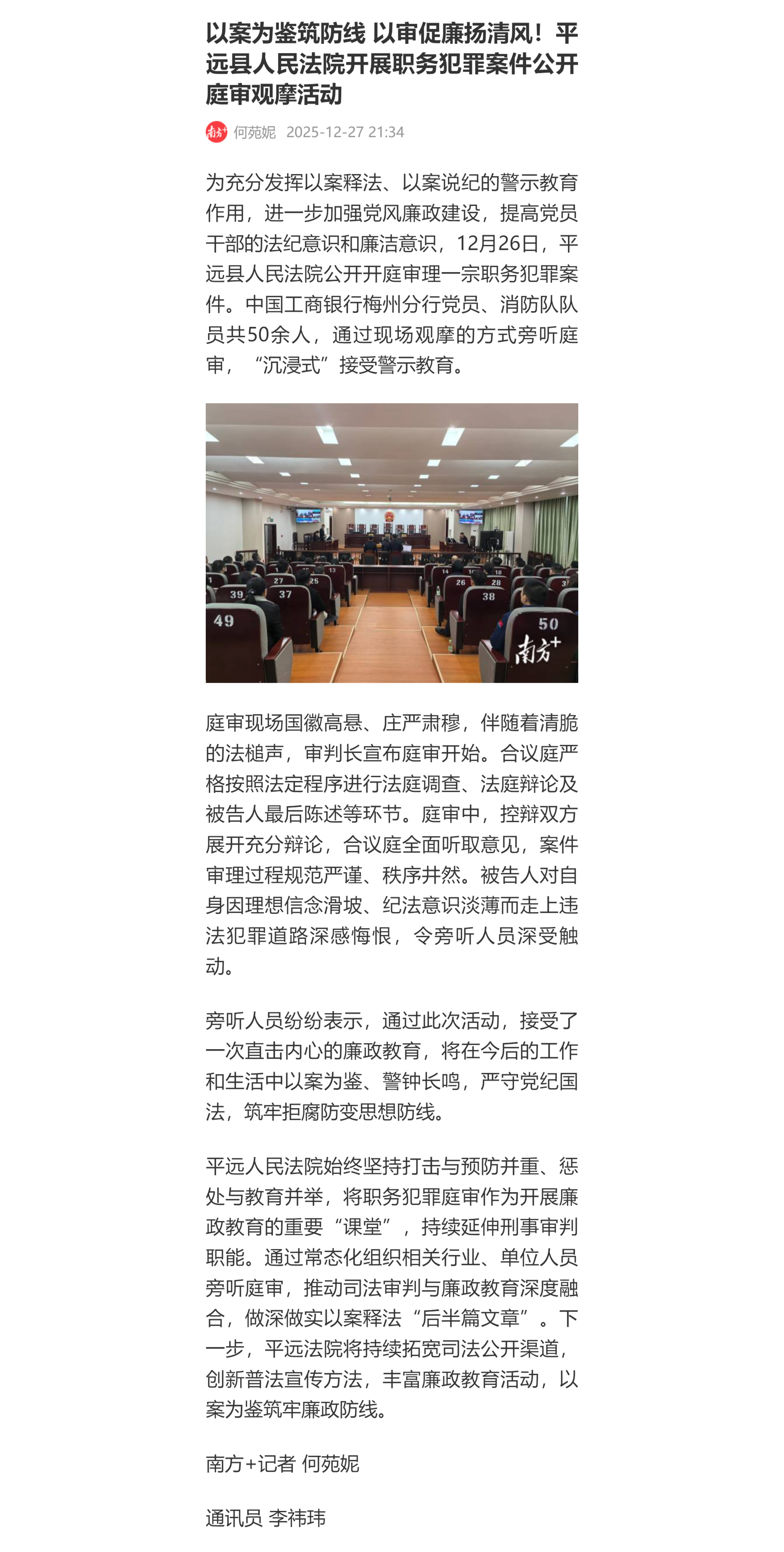 以案为鉴筑防线 以审促廉扬清风!平远县人民法院开展职务犯罪案件公开庭审观摩活动