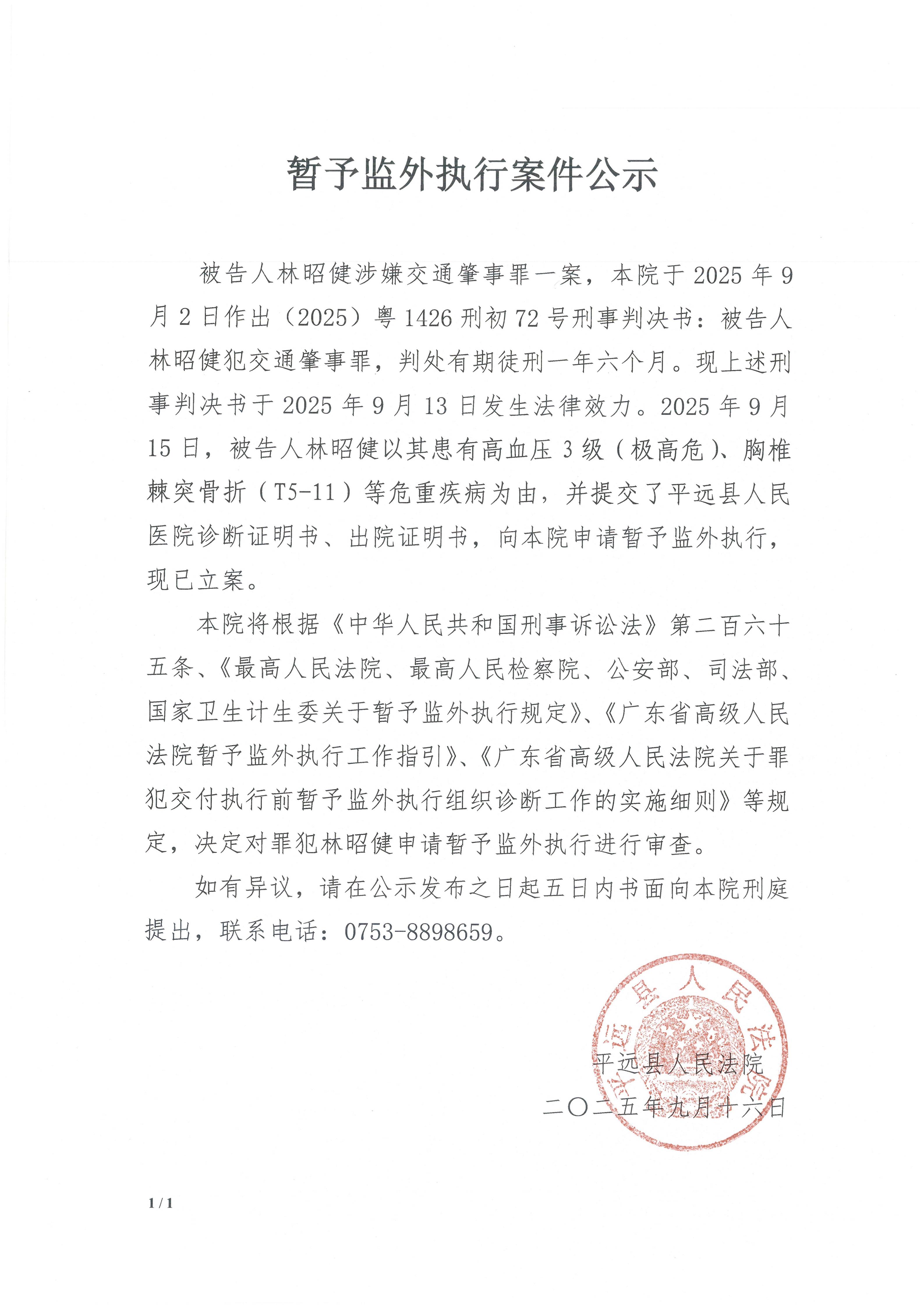 暂予监外执行案件公示(林昭健)