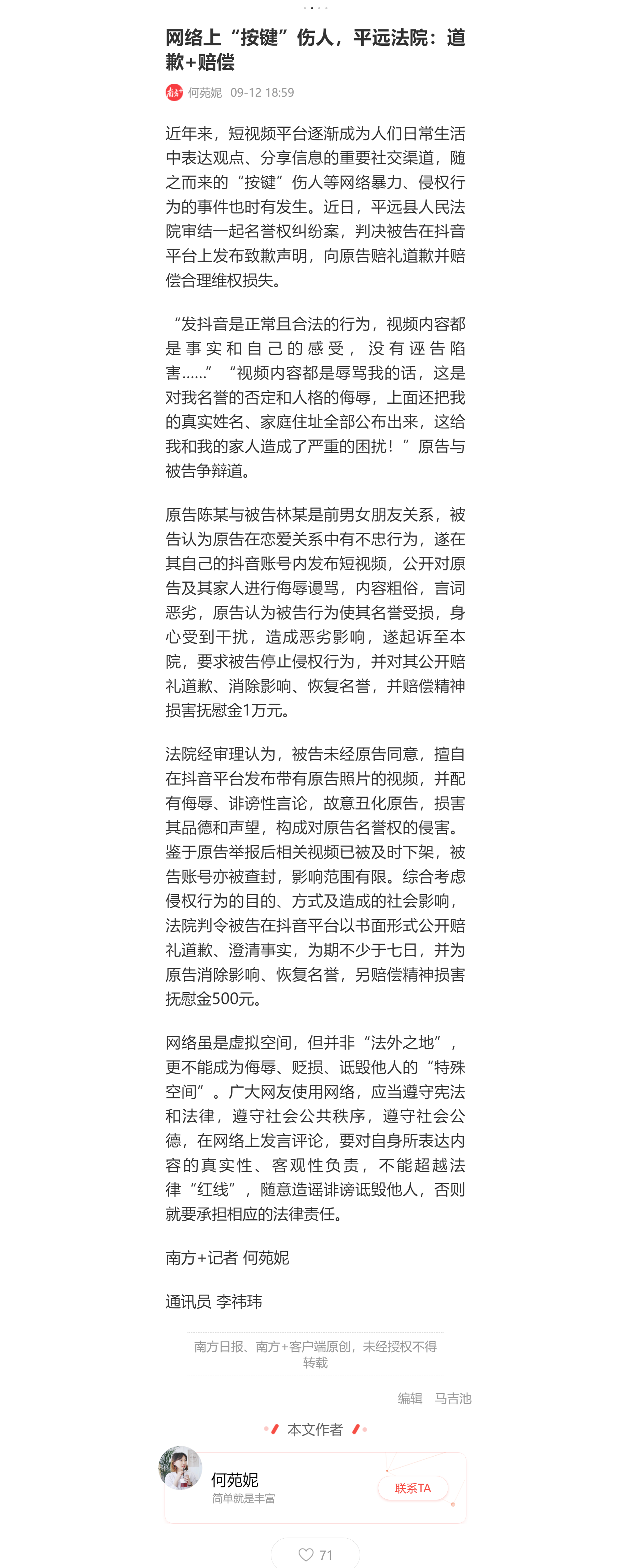 网络上“按键”伤人,平远法院:道歉+赔偿